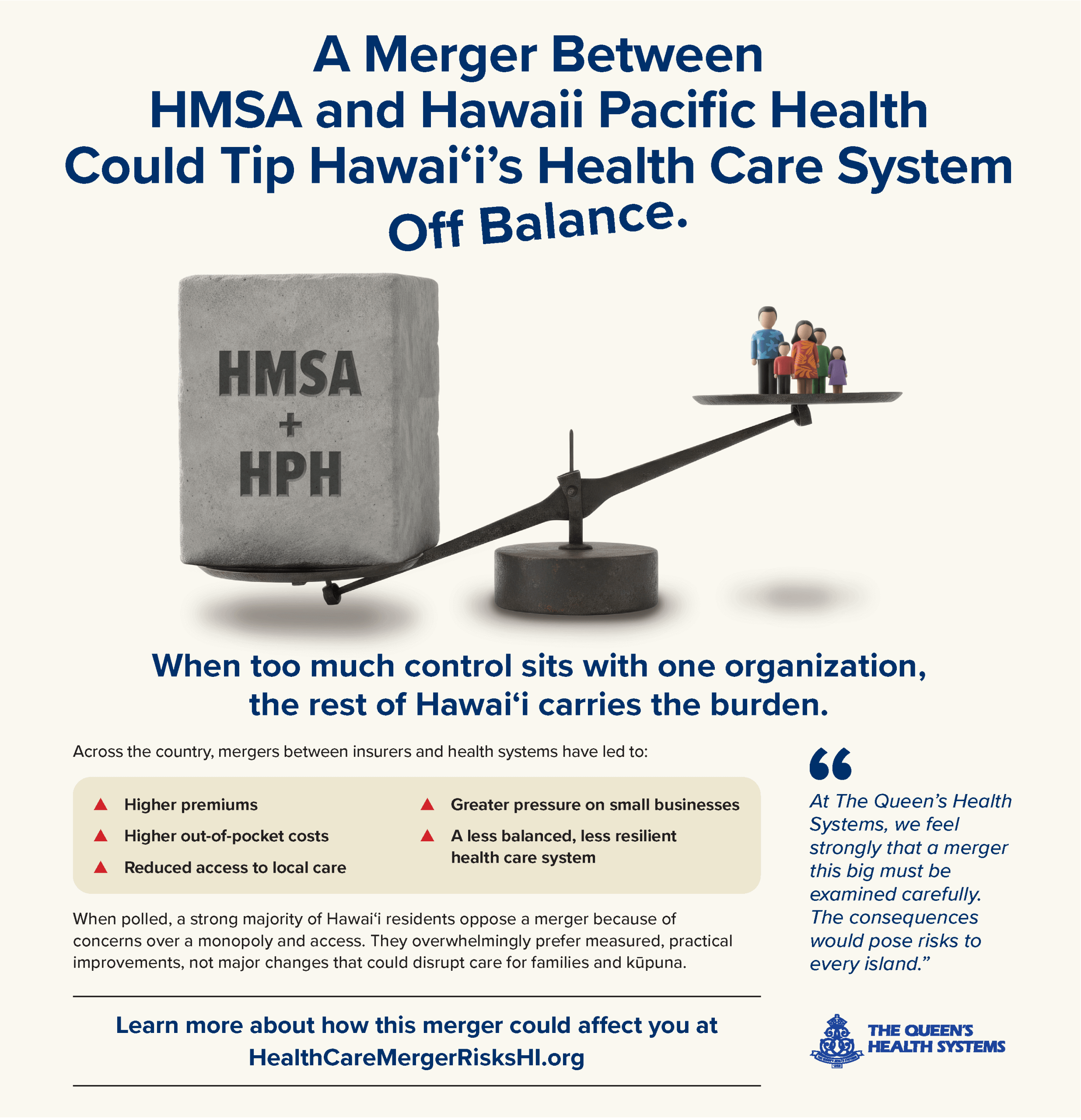 Hawai‘i already struggles with some of the highest health care costs in the nation. Families, kūpuna, and small businesses are doing everything they can to keep up. At The Queen’s Health Systems, we believe strongly that a merger between HMSA and Hawaii Pacific Health (HPH) raises serious and immediate concerns for all Hawai‘i residents.